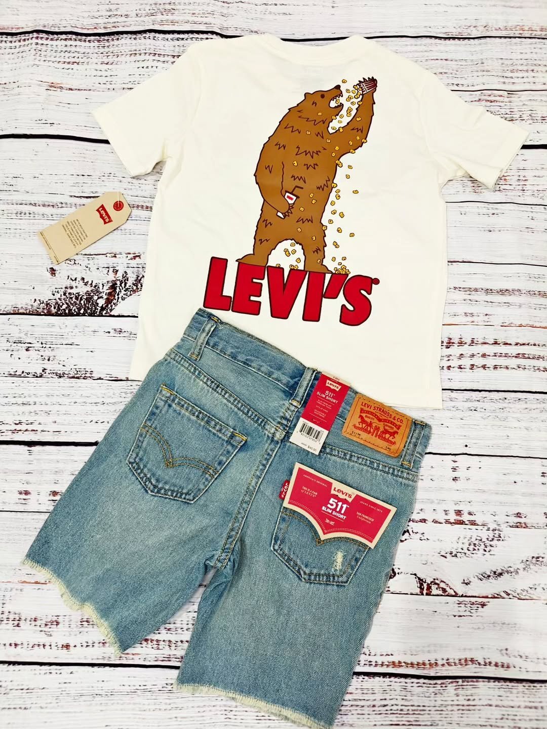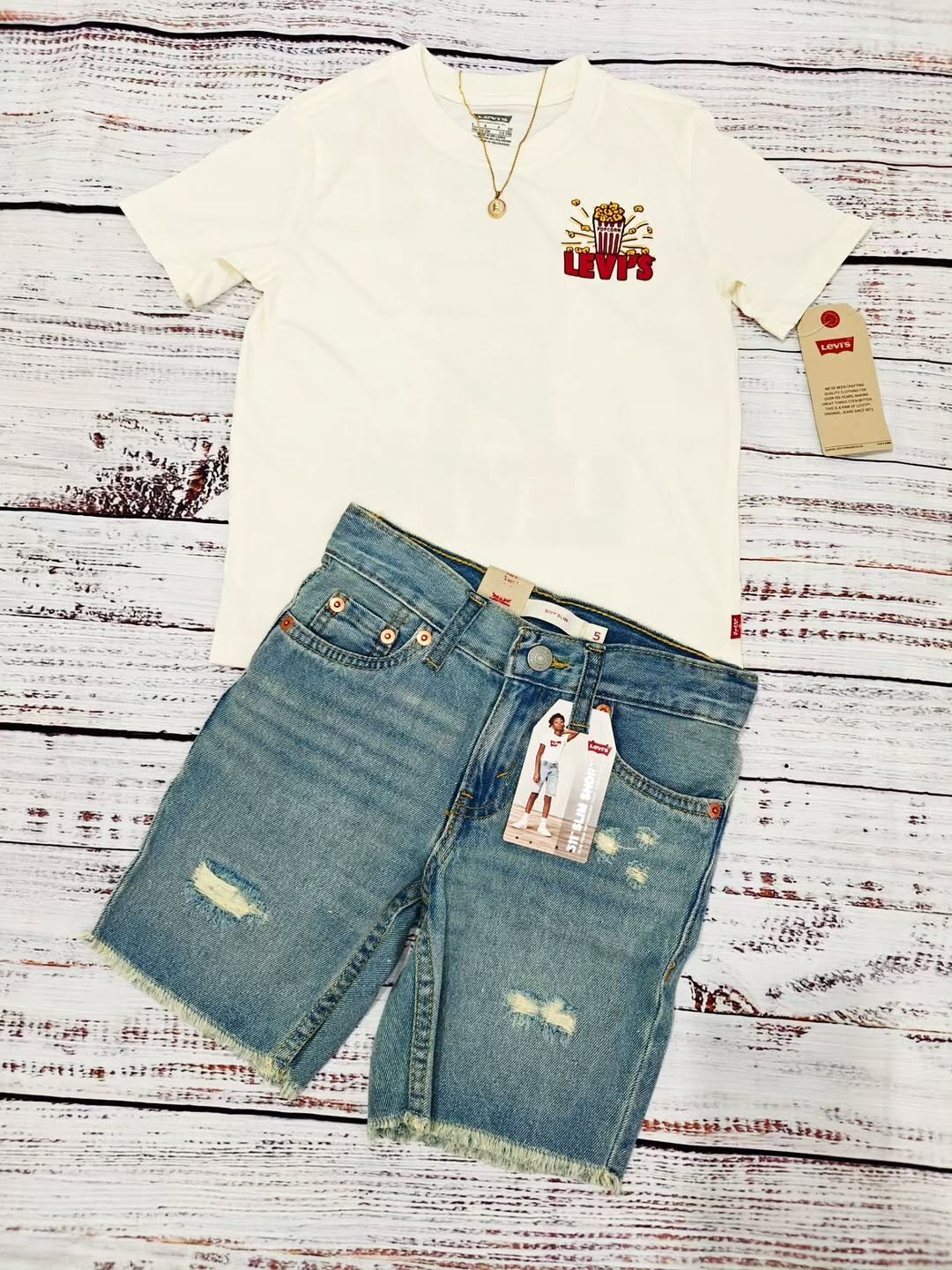 A fun and casual set featuring classic 511 denim shorts and a playful “Popcorn Obsessed” t-shirt. Perfect for everyday adventures with style and comfort.