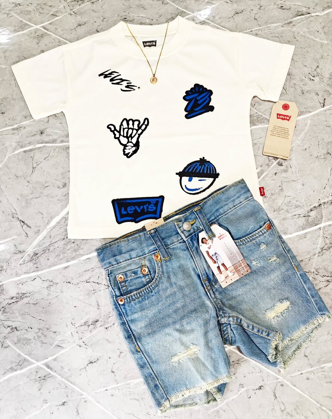 A playful tee and Levi’s 511 denim shorts — comfy, stylish, and ready for any little adventure!